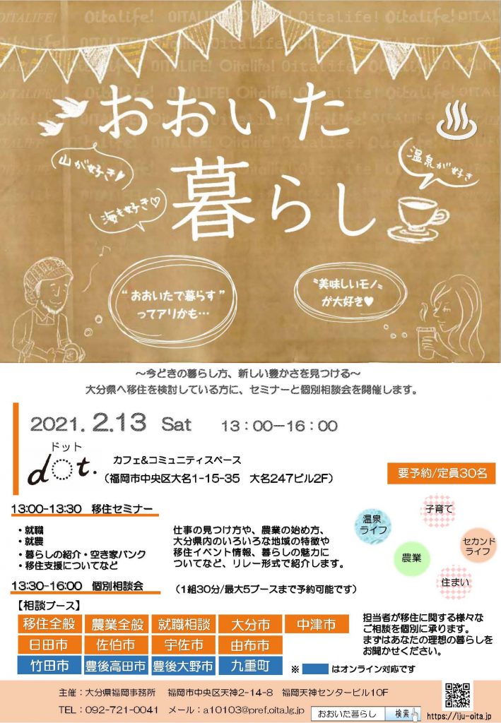 【開催中止】2月13日(土)移住セミナー・相談会「おおいた暮らし塾in福岡」開催のお知らせ